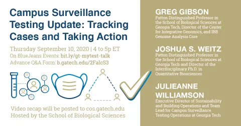 Patton Distinguished Professors Joshua S. Weitz and Greg Gibson will join JulieAnne Williamson, Executive Director of Sustainability and Building Operations at Georgia Tech and Team Lead for Campus Surveillance Testing Operations, to discuss campus cases and tracking, actions taken to date, and next steps.