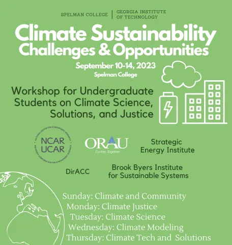 The workshop will be held at Spelman College, September 10-14, 2023 with each day having keynote presentations, panel discussions, and student research presentations organized around the themes of climate & community, climate justice, climate science, climate modeling, and climate tech & solutions.